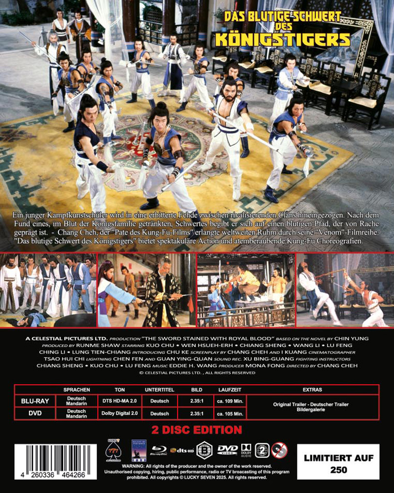 Ein junger Kampfkunstschüler wird in eine erbitterte Fehde zwischen rivalisierenden Clans hineingezogen. Nach dem Fund eines, im Blut der Königsfamilie getränkten, Schwerts begibt er sich auf einen blutigen Pfad, der von Rache geprägt ist. Chang Cheh, der „Pate des Kung.-Fu-films“ erlangte weltweiten Ruhm durch seine „Venom“-Filmreihe. „Das blutige Schwert des Königstigers“ bietet spektakuläre Action und atemberaubende Kung-Fu Choreografien.